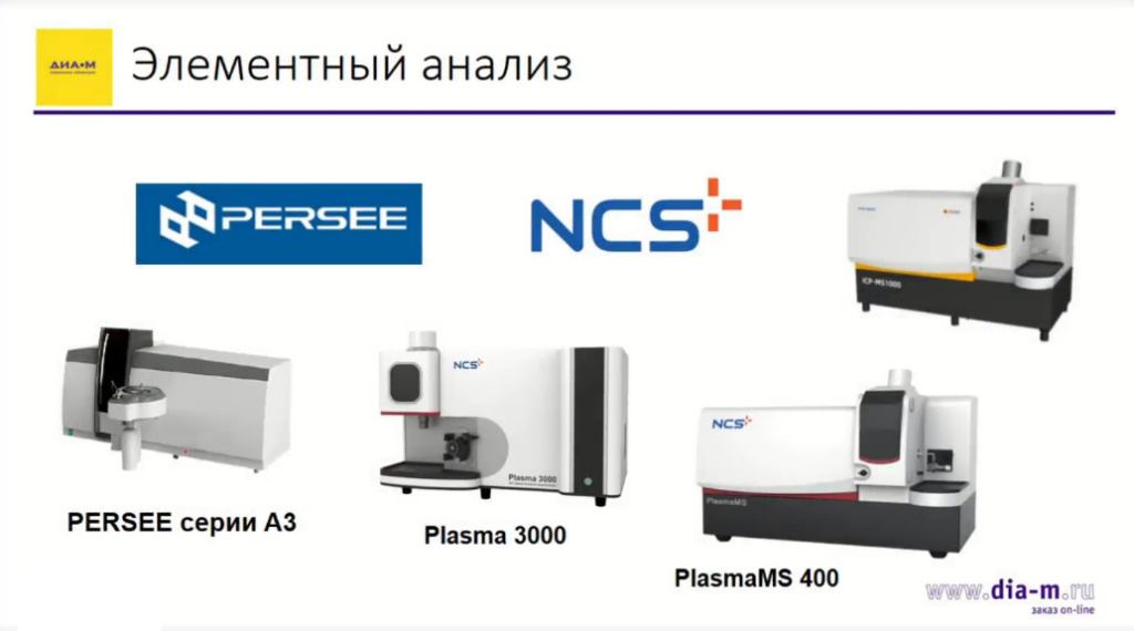 Она имеет московский офис, свой сервисный центр и один из крупнейших складов оборудования в России. Фото, представленные на слайде – это не случайные иллюстрации из Всемирной сети, а фотографии реального склада «Диаэм». И сегодня для обеспечения элементного анализа мы располагаем рядом интересных предложений.