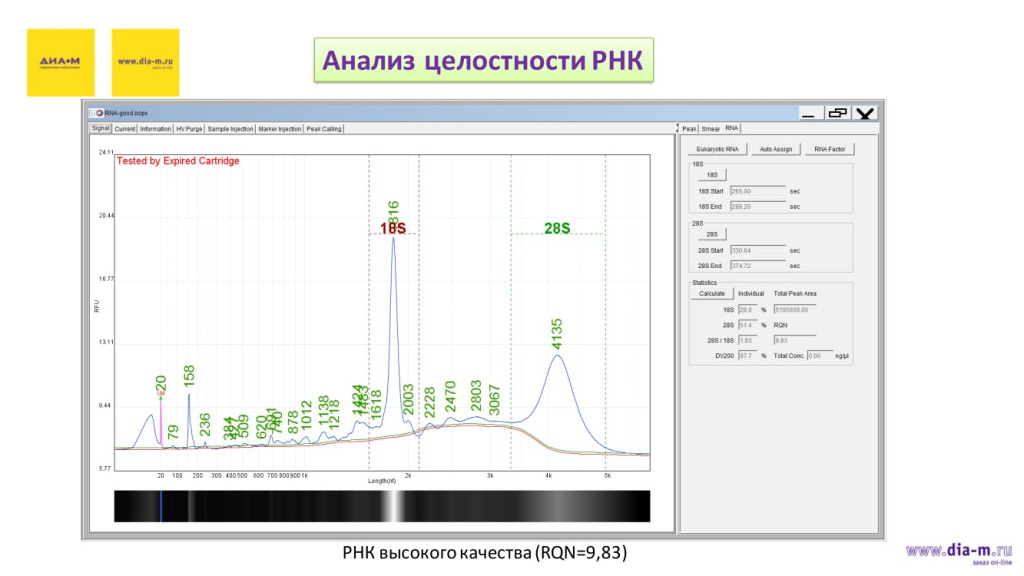 На следующем изображении этот индекс пониже – около 7, и по идее это нужно рассматривать как признак РНК низкого качества. Но недавно, показывая эти результаты в Томске, автор вебинара выяснил, что в принципе специалисты, которые занимаются там исследованием РНК, готовы работать и при наличии РНК с таким индексом – для них это нормально, это дело опыта.