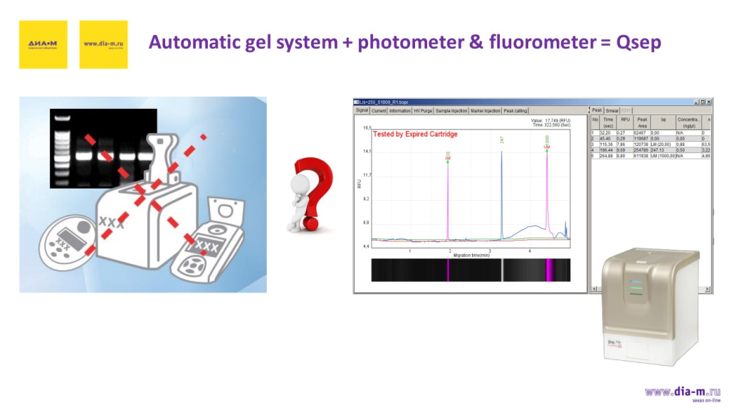 Фрагментный анализатор Qsep – это прибор, который объединяет в себе гель-электрофорез, частично спектрофотометр (за исключением того, что чистоту исследуемого образца и наличие каких-то примесей он не покажет) и флуориметр. Если нет возможности или желания использовать в лаборатории несколько приборов, можно заменить их фрагментным анализатором Qsep. Большинство задач он решает. (Рис. 2)