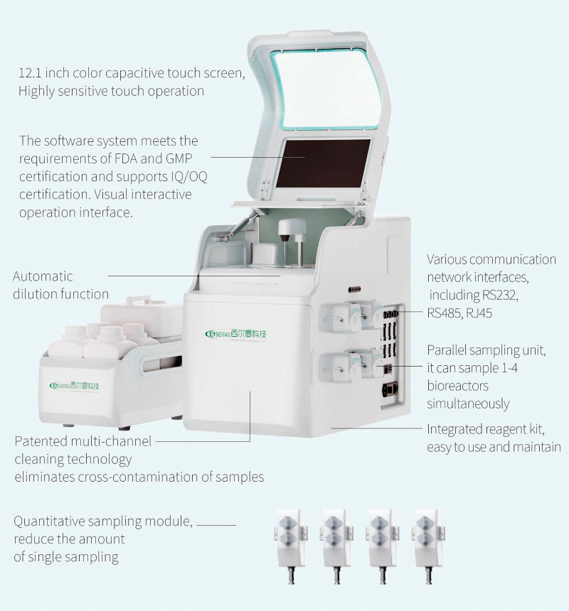 Способен одновременно отбирать пробы из 4-х биореакторов. Зонд для отбора проб имеет интерфейс PG13.5 или Ingold, подходит для различных реакторов из нержавеющей стали, стекла и одноразовых реакторов.