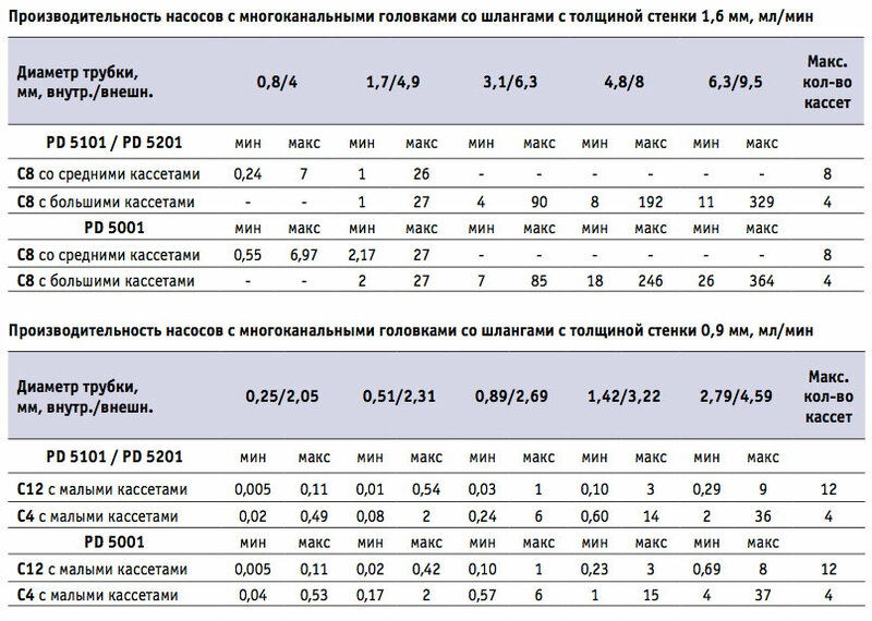 - производительность, мл/мин — 0,0002-825 (зависит от перистальтической головки);