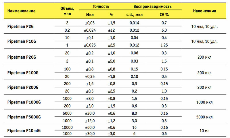 В этой серии выпускаются пипетки Pipetman G переменного объема от 0,2 до 10000 мкл (8 диапазонов объемов).