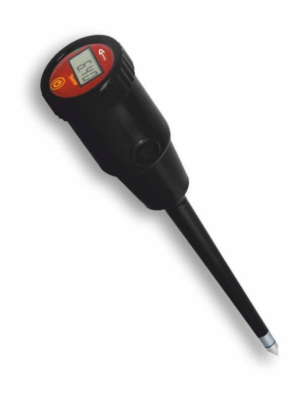 - вставить металлический зонд в почву вертикально и по часовой стрелке на глубину примерно 6-8 см. Убедитесь, что почва плотно соприкасается с металлическим зондом. Примерно через 6 секунд тестер отобразит измеренное значение. Плотность почвы повлияет на результат измерения;