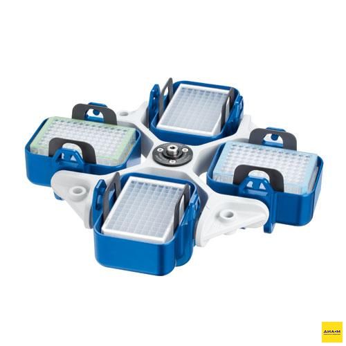 Поставляется с 4 круглыми бакетами на 750 мл с аэрозоленепроницаемыми крышками или с 4 бакетами для глубоколуночных планшет.
