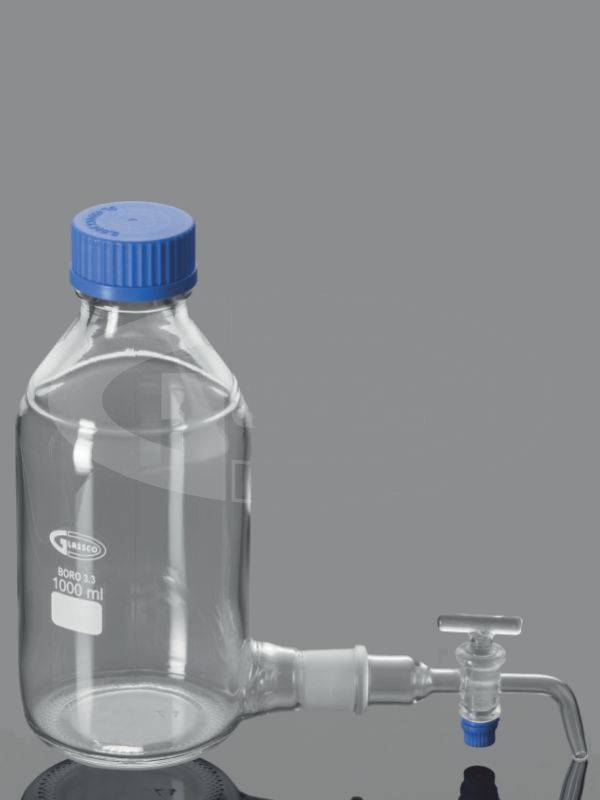Склянка-аспиратор представляет собой бутыль с соединительной муфтой со шлифом в нижней части, к которой присоединен запорный кран. Изготавливается из термостойкого и химически стойкого стекла. Применяется для хранения или раздачи различных химических веществ.