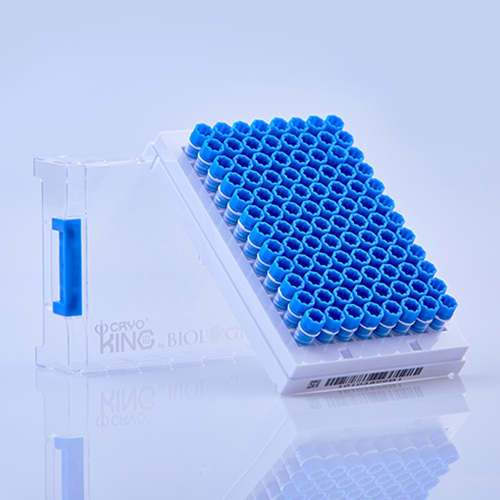 Криопробирки 1 мл, SBS формат, синие крышки, ПП, штрих-код на дне пробирок, штрих-код на дне штативов, конические, с юбкой, стерильные, бесцветные, 96 шт./штат., 10 штат./уп., 2 уп./кор., Biologix, Китай
