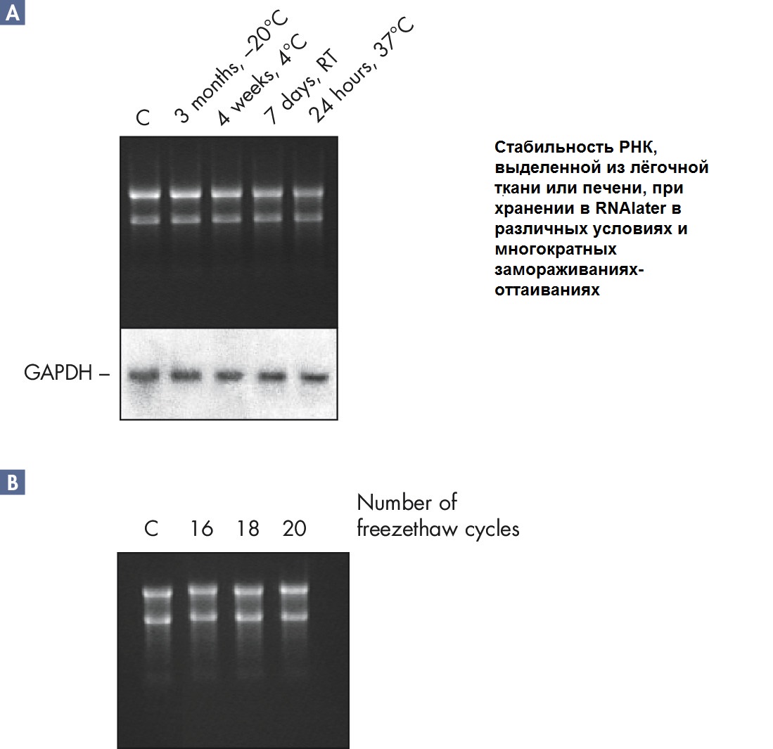 Стабилизированные в RNAlater образцы могут храниться до 1 суток при +37, до 7 суток при комнатной температуре, до 4 недель при +2-8 °С или неограниченно при -20 или -80 °С.