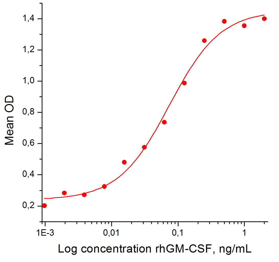 Рекомбинантный белок rhGM-CSF человека стимулирует пролиферацию клеток линии эритролейкоза человека (TF-1). ED50 рекомбинантного белка rhGM-CSF для данного эффекта обычно 0,1-0,6 нг/мл. Оптимальная концентрация для индивидуального применения определятся пользователем.