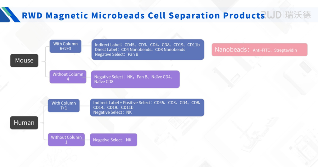 Продукты для разделения клеток RWD включают в себя наборы для разделения клеток с магнитными микрошариками и колонки для разделения клеток, которые позволяют проводить сепарацию с высокой чистотой и высокой жизнеспособностью за счет простой работы. Наноразмерные магнитные шарики не требуют элюции, а разделенные клетки можно напрямую использовать в последующих экспериментах, таких как проточная цитометрия, культивирование клеток, секвенирование отдельных клеток и т.д.