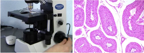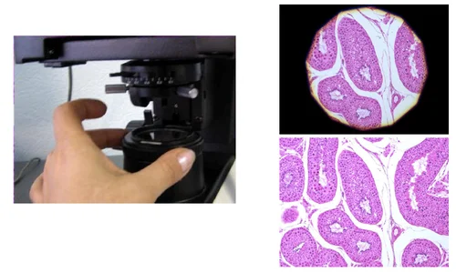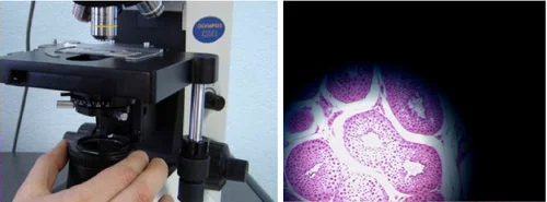 1. Получите резкое изображение образца с помощью объектива 10х или большего увеличения, так, чтобы вы могли видеть хотя бы какой-нибудь участок в фокусе (если у конденсора имеется откидная фронтальная линза, установите ее в ход лучей при использовании объективов с увеличением более 10х).